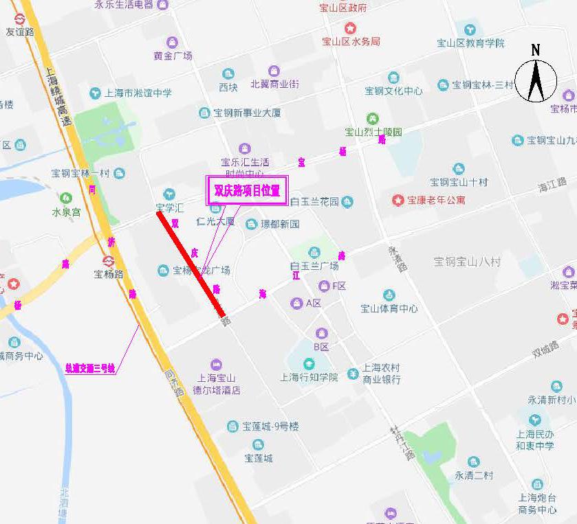 本次工程设计范围为双庆路(宝杨路~海江路)段,该段道路北起宝杨路(城市主干路),南至海江路(城市支路),路线全长约494.07m。